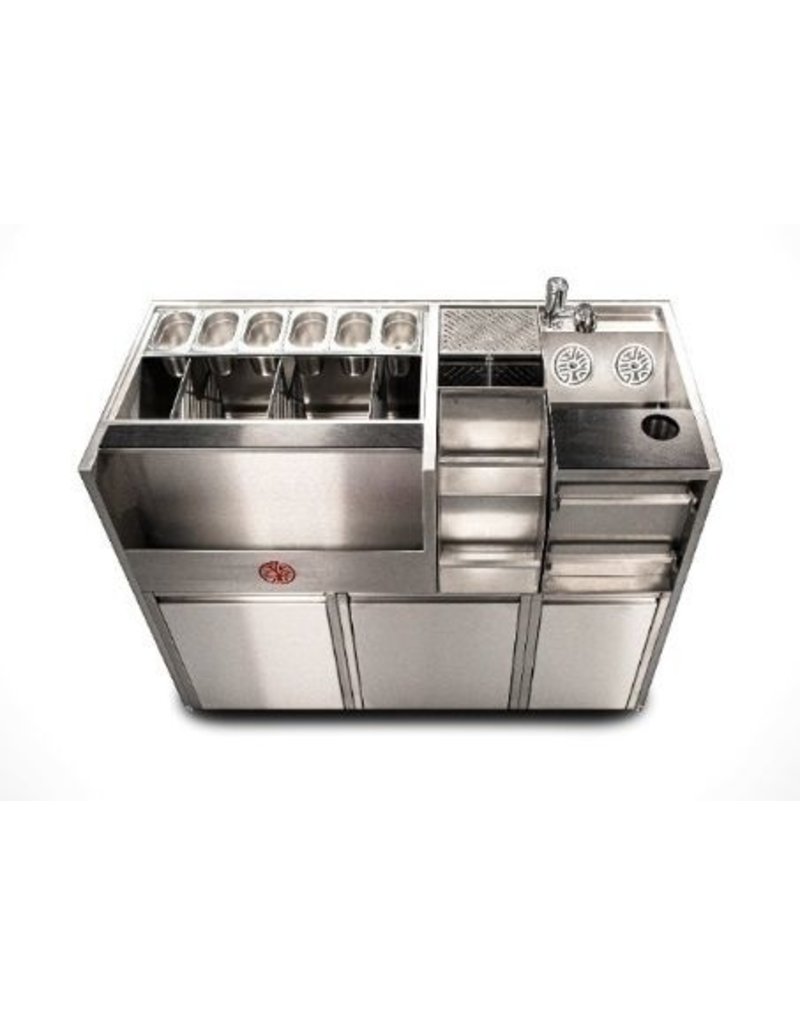 Quầy cocktail được xây dựng bằng thép không gỉ. Được lắp ráp như một gói hoàn chỉnh, thiết bị này bao gồm một thùng đá lớn với vỏ thép không gỉ có foam cách nhiệt bên trong, một bồn rửa, ngăn chứa 7-8 chai phía trước có ray tốc độ,dãy khay để làm lạnh hỗn hợp, một cái thớt khoét lỗ rác, kệ để máy xay dinh tố 2 tầng, một dãy giữ khăn và một vòi nước lạnh.