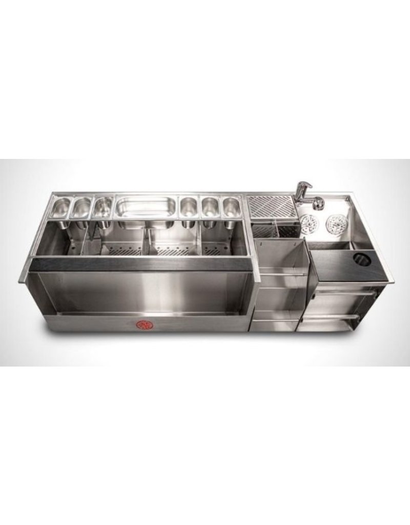 Quầy cocktail được xây dựng bằng thép không gỉ. Được lắp ráp như một gói hoàn chỉnh, thiết bị này bao gồm một thùng đá lớn với vỏ thép không gỉ, một bồn rửa, ngăn chứa 10-12 chai phía trước có ray tốc độ, ủng đóng chai để làm lạnh hỗn hợp, một cái thớt khoét lỗ rác, kệ để máy xay dinh tố 2 tầng, một dãy giữ khăn và một vòi nước lạnh.